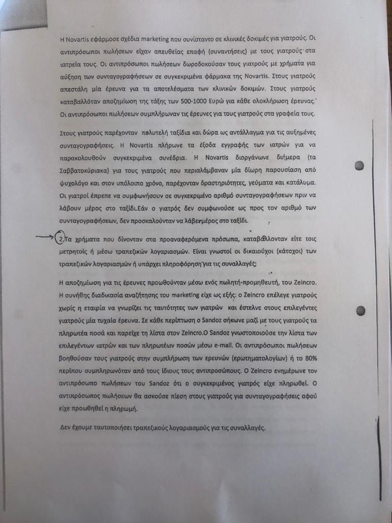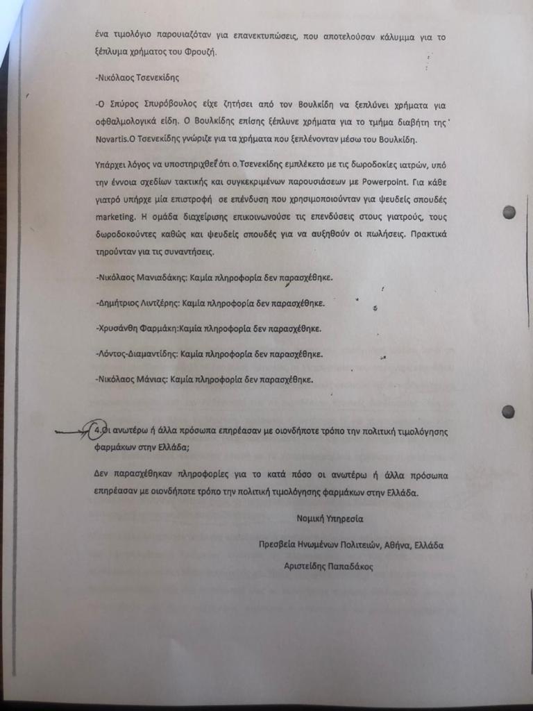 Στο έγγραφο που είναι έκθεση του Ομοσπονδιακού Γραφείου Ερευνών των ΗΠΑ οι αμερικανικές αρχές απαντούν σε τέσσερα συγκεκριμένα ερωτήματα που τους θέτει η εισαγγελέας Διαφθοράς Ελένη Τουλουπάκη αναφορικά με στοιχεία που διαθέτουν για χρηματισμούς Ελλήνων ιατρών, αξιωματούχων και πολιτικών.