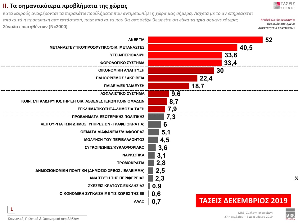 Η MRB αφιέρωσε μια ξεχωριστή ενότητα στην έρευνά της για τα προβλήματα που αντιμετωπίζει σήμερα η χώρα. Σύμφωνα με τις απαντήσεις που έδωσαν οι πολίτες, το μεγαλύτερο πρόβλημα σήμερα είναι η ανεργία (52%), ενώ ακολουθεί το μεταναστευτικό/προσφυγικό (40,5%). Οι πολίτες χαρακτήρισαν σημαντικά τα προβλήματα που αντιμετωπίζει ο τομέας της Υγείας/περίθαλψης (33,6%), ενώ ψηλά στη σχετική λίστα βρίσκεται και το φορολογικό σύστημα (33,4%).