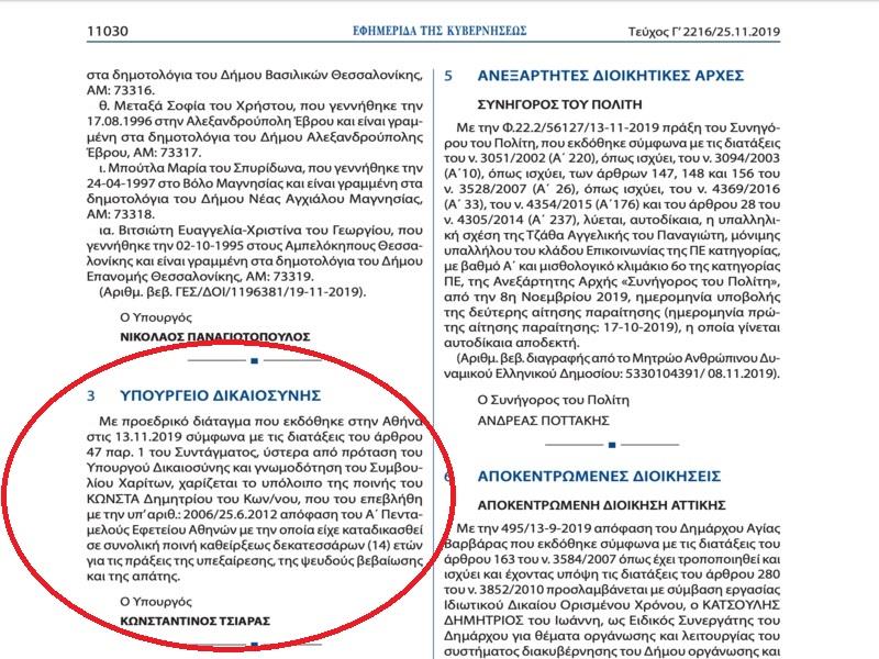 «Με προεδρικό διάταγμα που εκδόθηκε στην Αθήνα στις 13.11.2019 σύμφωνα με τις διατάξεις του άρθρου 47 παρ. 1 του Συντάγματος, ύστερα από πρόταση του Υπουργού Δικαιοσύνης και γνωμοδότηση του Συμβουλίου Χαρίτων, χαρίζεται το υπόλοιπο της ποινής του ΚΩΝΣΤΑ Δημητρίου του Κων/νου, που του επεβλήθη με την υπ’ αριθ.: 2006/25.6.2012 απόφαση του Α΄ Πενταμελούς Εφετείου Αθηνών με την οποία είχε καταδικασθεί σε συνολική ποινή καθείρξεως δεκατεσσάρων (14) ετών για τις πράξεις της υπεξαίρεσης, της ψευδούς βεβαίωσης και της απάτης» σημειώνεται στο ΦΕΚ, το οποίο υπογράφει ο υπουργός Δικαιοσύνης.