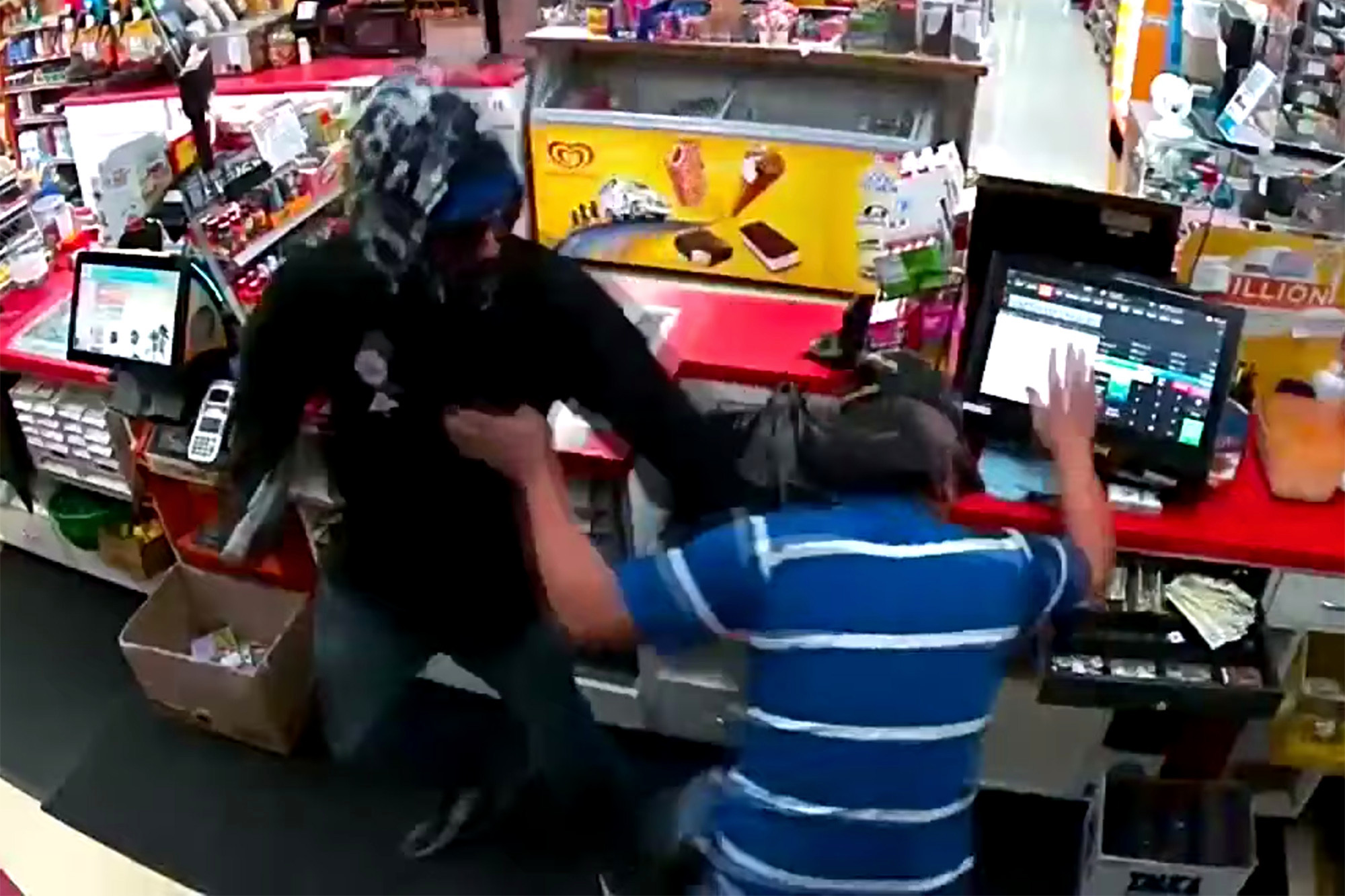 Όπως φαίνεται ο 56χρονος δέχεται αρκετά χτυπήματα στο κεφάλι από το όπλο του επίδοξου ληστή μέχρι που κάποια στιγμή αρπάζει το δικό του όπλο.