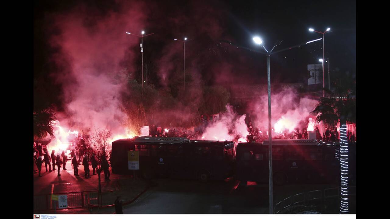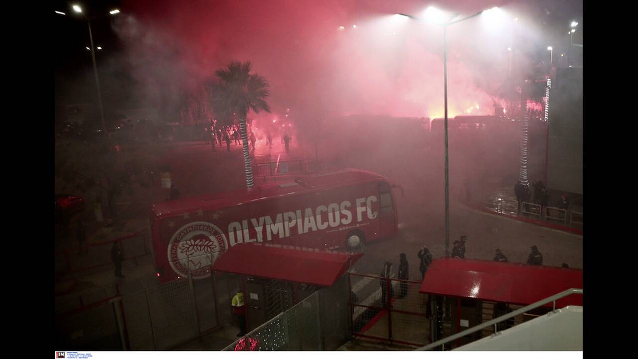 Τη στιγμή της άφιξης του Ολυμπιακού οι οπαδοί άναψαν καπνογόνα και «βαρελάκια», φωνάζοντας συνθήματα, ενώ λίγη ώρα αργότερα υπήρξε ένταση με την αστυνομία.