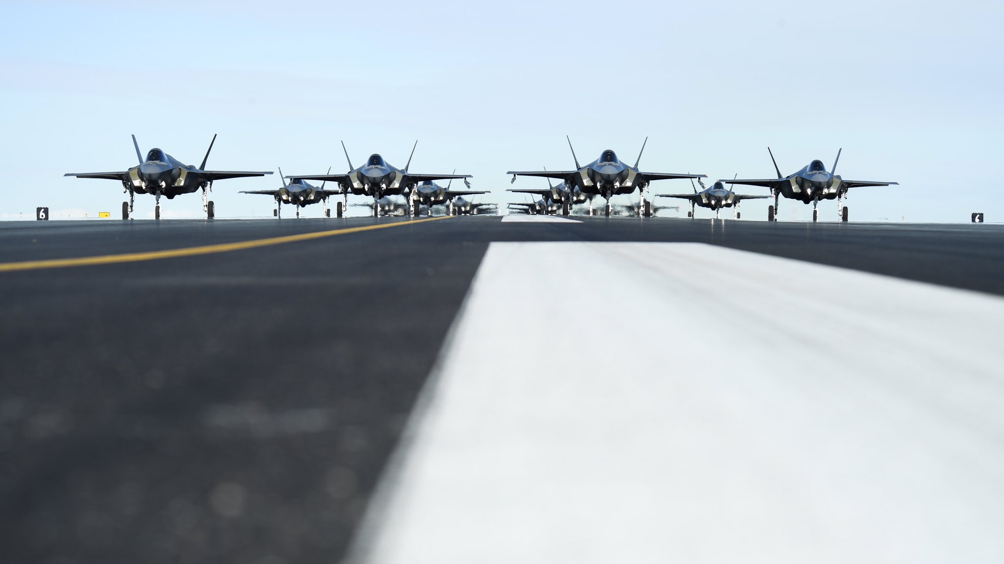 Επίδειξη δύναμης πραγματοποίησε η Πολεμική Αεροπορία των ΗΠΑ, με 52 πλήρως οπλισμένα μαχητικά Stealth τύπου Lightning II να απογειώνονται το ένα πίσω από το άλλο, σε ένα «κύμα» απογείωσης, αφότου αρχικά είχαν παραταχθεί σε έναν εντυπωσιακό σχηματισμό σε διάδρομο προσαπογείωσης.