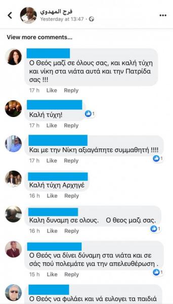 Σύμφωνα με το sigmalive.com κάτω από την ανάρτησή του Ναύαρχου, πολλοί Έλληνες, συμπεριλαμβανομένων και αξιωματικών εν αποστρατεία, γράφουν, μεταξύ άλλων: «Ο Θεός μαζί σε όλους σας, και καλή τύχη και νίκη στα νιάτα αυτά και την πατρίδα σας!», «καλή τύχη Αρχηγέ», «ο Θεός να φυλάει να ευλογεί τα παιδιά», «και με την νίκη αξιαγάπητε συμμαθητή», «ο Θεός να δίνει δύναμη στα νιάτα και σε εσάς που πολεμάτε για την απελευθέρωση».