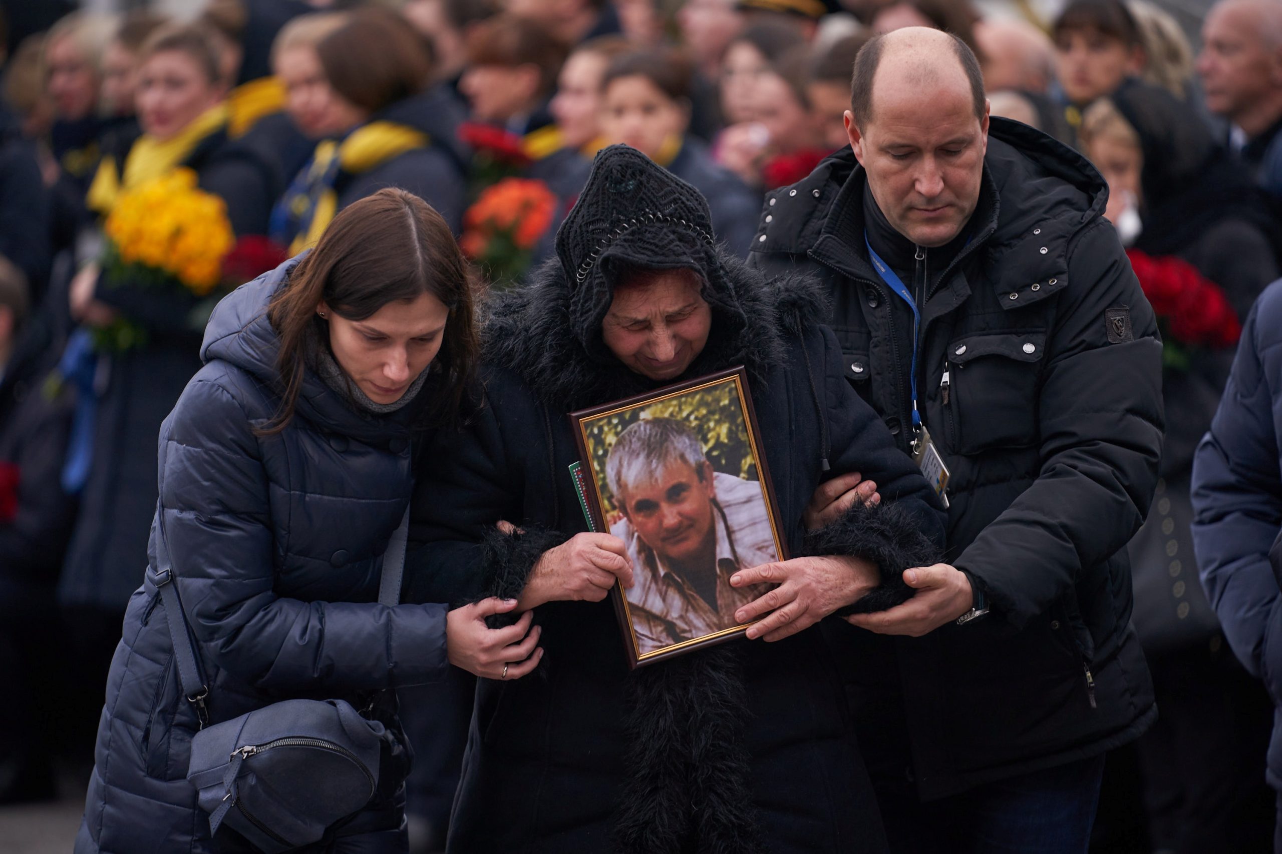 Παρουσία του προέδρου Βολοντίμιρ Ζελένσκι, φέρετρα καλυμμένα με την ουκρανική σημαία μεταφέρθηκαν ένα-ένα από ουκρανικό στρατιωτικό αεροπλάνο σε νεκροφόρες που περίμεναν στο αεροδρόμιο.