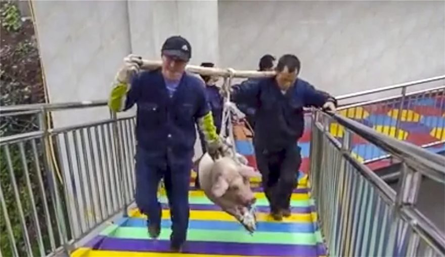 Τοπικά Μέσα ενημέρωσης αναφέρουν μάλιστα πως μετά το σοκαριστικό στιγμιότυπο ο χοίρος εστάλη σε σφαγείο.