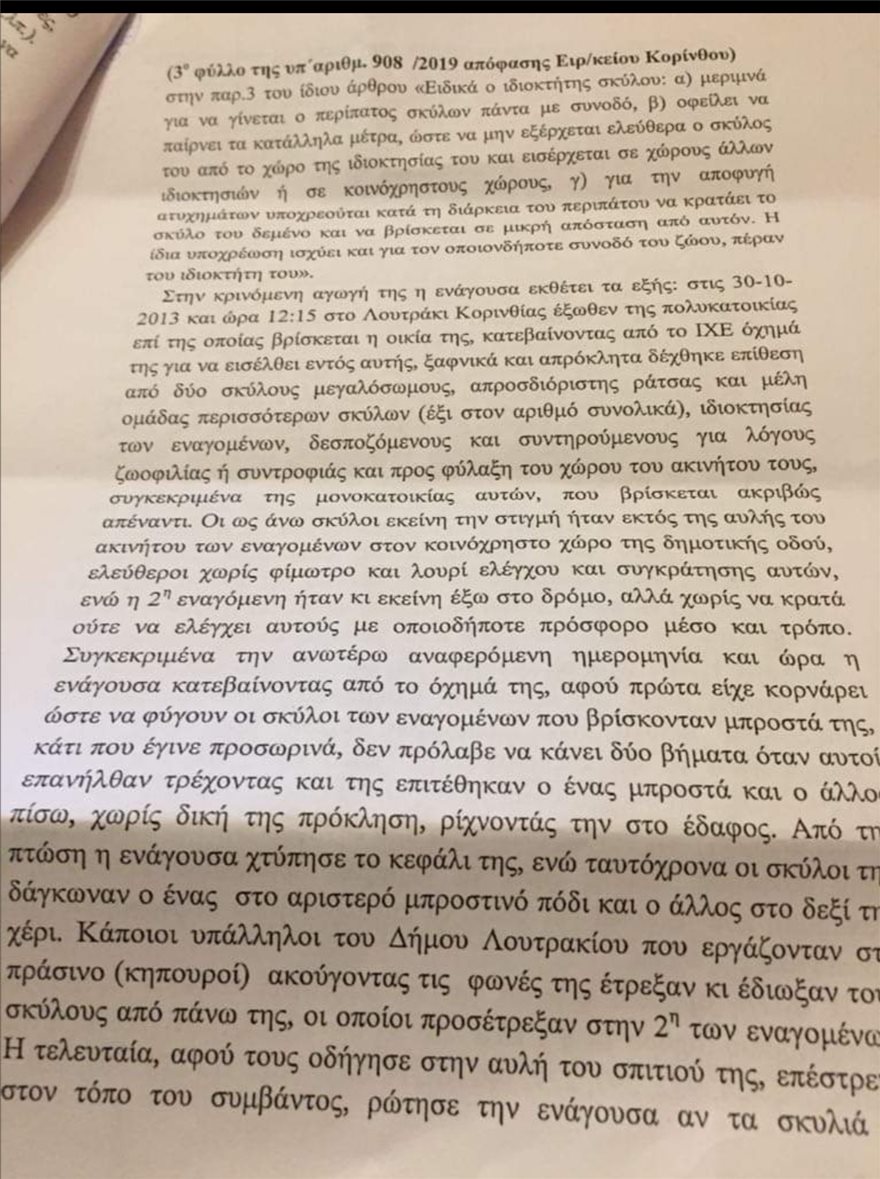 Το περιστατικό συνέβη στο Λουτράκι Κορινθίας στις 30-10-2013 και ώρα 12.15. Η 63χρονη τότε γυναίκα είχε βγει από το αυτοκίνητο της με σκοπό να μπει στη πολυκατοικία όπου διαμένει. Ξαφνικά και απρόκλητα, προτού καλά καλά διασχίσει τον δρόμο δέχθηκε επίθεση από δυο μεγαλόσωμους σκύλους απροσδιόριστης ράτσας-μέλη ομάδας σκύλων (έξι στον αριθμό συνολικά) που άνηκαν σε ηλικιωμένο ζευγάρι το οποίο διαμένει στη διπλανή μονοκατοικία.