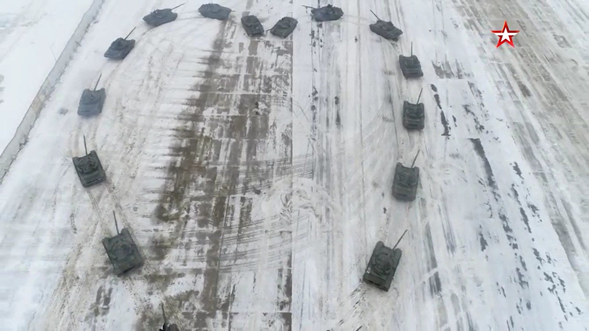Στο βίντεο που έδωσε στη δημοσιότητα το υπουργείο Άμυνας της Ρωσίας, διακρίνονται δεκαέξι άρματα μάχης T-72B3 να σχηματίζουν μια καρδιά στο χιονισμένο τοπίο, στη στρατιωτική βάση Αλαμπίνο, κοντά στη Μόσχα.