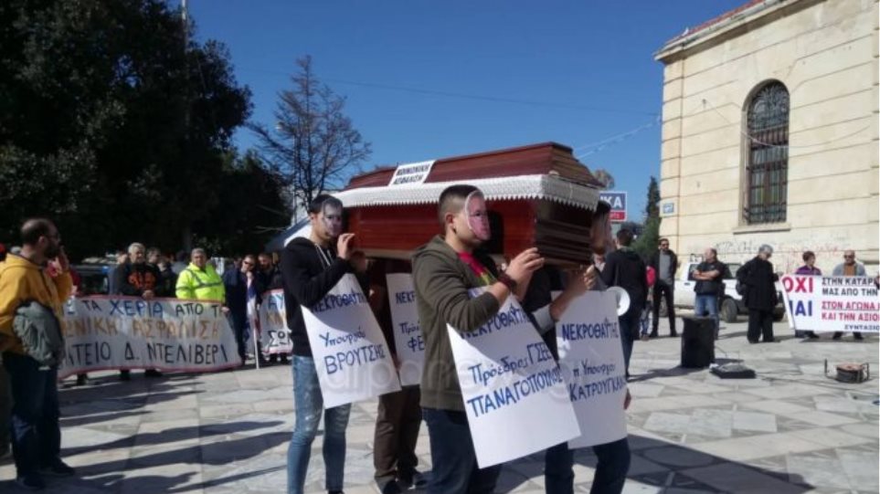 Οι συγκεντρωμένοι μάλιστα, κατέβασαν μέχρι και… φέρετρο στην κινητοποίηση, προσομοιάζοντας το με τον “θάνατο της κοινωνικής ασφάλισης” και την “κηδεία” που γίνεται με το παρόν νομοσχέδιο.