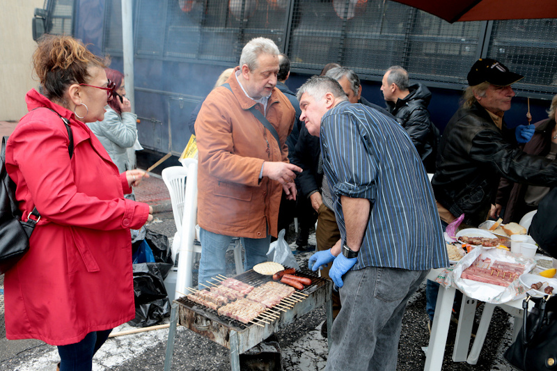Σε μία πρωτότυπη διαμαρτυρία προχώρησαν μέλη της ΠΟΕΔΗΝ λίγα μέτρα μακριά από το Μέγαρο Μαξίμου και συγκεκριμένα στη συμβολή της Βασιλίσσης Σοφίας με την οδό Ηρώδου Αττικού, όπου έχουν στήσει ψησταριά και λόγω Τσικνοπέμπτης ψήνουν σουβλάκια και λουκάνικα.