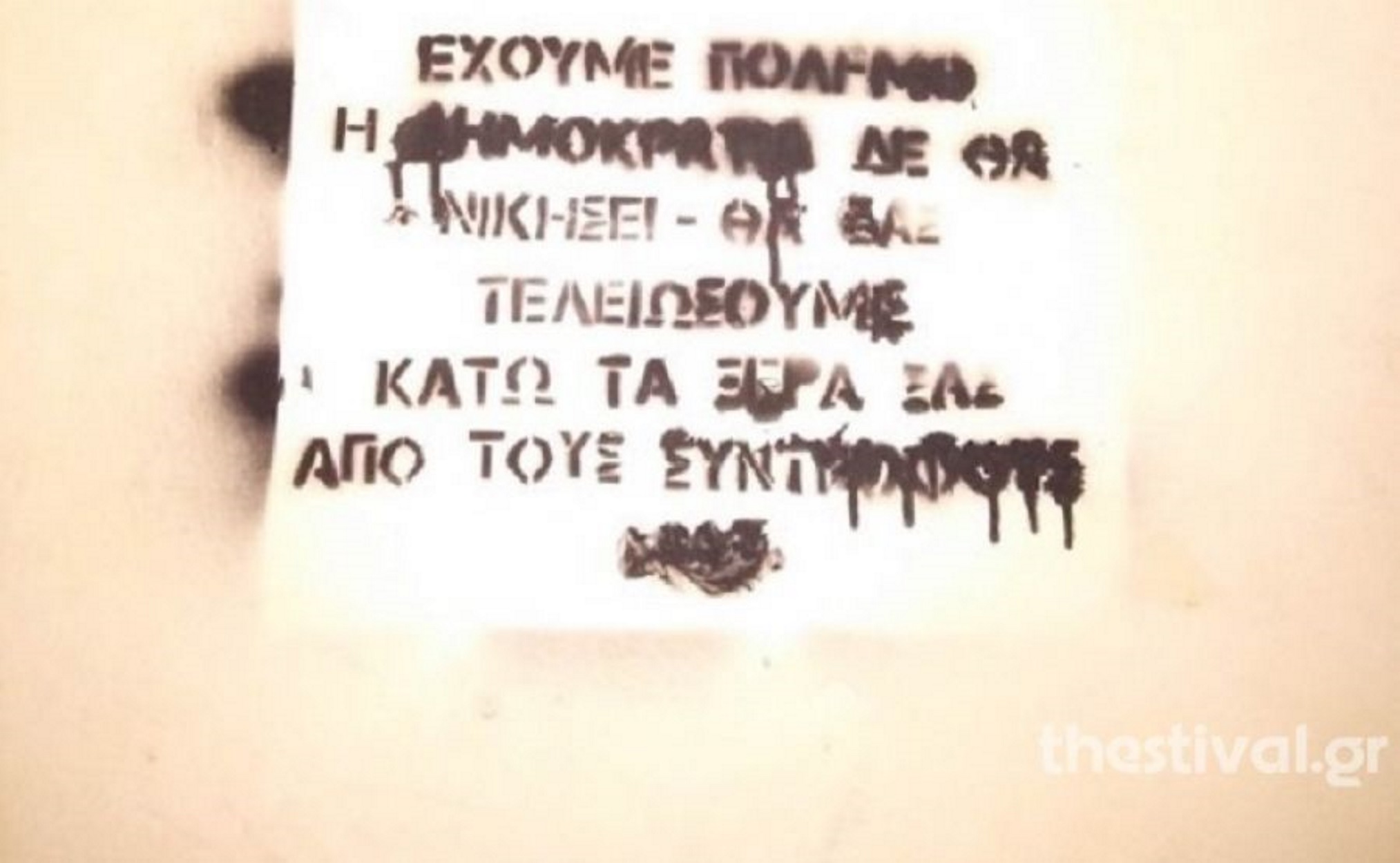 Συνθήματα έγραψαν άγνωστοι στο ισόγειο πολυκατοικίας όπου στεγάζεται το πολιτικό γραφείο του βουλευτή της ΝΔ, Δημήτρη Κούβελα, στη Θεσσαλονίκη, επί της οδού Μητροπόλεως.