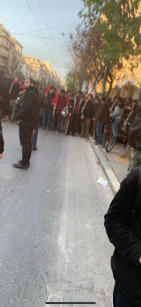 Περίπου 1.000 συγκεντρωμένοι έχουν κλείσει την Πατησίων στο ρεύμα προς Πατήσια και πραγματοποιούν πορεία προς την ΓΑΔΑ. Πετούν τρικάκια και φωνάζουν συνθήματα όπως «κάτω τα χέρια από το άσυλο, το άσυλο ανήκει σε όλο το λαό» και «έξω η ασφάλεια από τις σχολές».