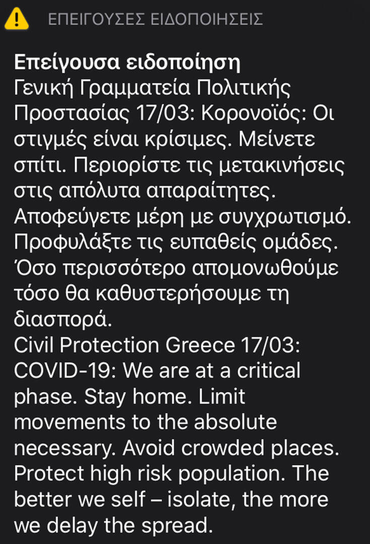 «Επείγουσα προειδοποίηση – Γενική Γραμματεία Πολιτικής Προστασίας – Κορονοϊός: Οι στιγμές είναι κρίσιμες. Μείνετε σπίτι. Περιορίστε τις μετακινήσεις στις απόλυτα απαραίτητες.