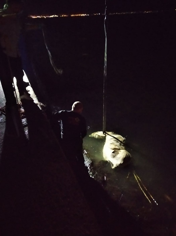 Αρχικά είχε ενημερωθεί το Λιμενικό Σώμα, ωστόσο, δεν μπόρεσε να επιχειρήσει καθώς τα νερά στο σημείο που βρισκόταν το άψυχο σώμα του άτυχου ζώου ήταν ρηχά. Αξίζει να σημειωθεί πως η αγελάδα έφερε ειδική σήμανση, η οποία φωτογραφήθηκε και θα αναζητηθεί ο κτηνοτρόφος στην οποία ανήκε.