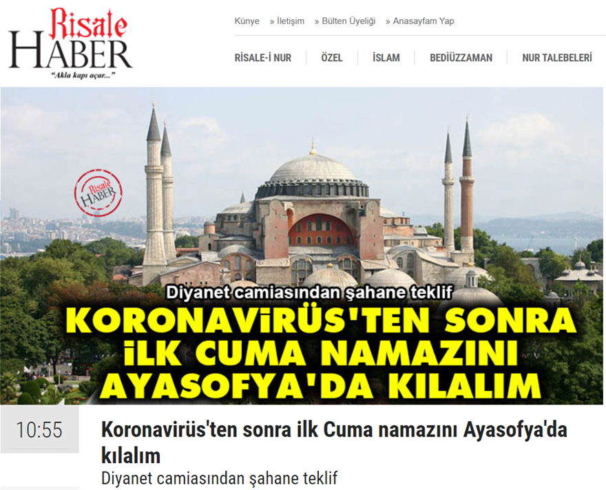 «Ας προσευχηθούμε την πρώτη Παρασκευή στην Αγία Σοφία για να δείξουμε στον κόσμο ότι χτίζεται μία νέα Τουρκία. Οι προετοιμασίες για τη δεύτερη κατάκτηση της Κωνσταντινούπολης πρέπει να γίνουν εκ των προτέρων. Με την προσευχή την πρώτη Παρασκευή μετά την άρση των μέτρων) πρέπει να δοθεί το μήνυμα στον ισλαμικό κόσμο ότι το χαλιφάτο ακόμη ζει και ότι οι κοινότητες που ζουν υπό τη σκιά της οθωμανικής δικαιοσύνης δεν πέθαναν. Η Αγία Σοφία είναι το μέσο για να επέλθει η Ανάσταση στον κόσμο. Πρέπει να δείξουμε με την πρώτη προσευχή στην Αγία Σοφία πως η Τουρκία δεν είναι η παλιά Τουρκία» δήλωσε προκλητικά ο επικεφαλής του συνδικάτου μουσουλμάνων ιερωμένων Τουρκίας, εκτιμώντας πως τίποτα δεν θα είναι το ίδιο μετά το τέλος της επιδημίας του κορωνοϊού.