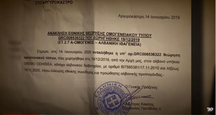 Το αλβανικό ντοκιμαντέρ παρουσιάζει ομιλίες με κρυφή κάμερα στο προξενείο του Αργυρόκαστρου με έναν Αλβανό κάτοικο ονόματι Gremo Odhisea του οποίου ανακλήθηκε η ‘θεώρηση ομογενειακού τύπου’ που του είχε χορηγηθεί λόγω προώθησης αλβανικής προπαγάνδας στα ελληνικά χωριά της περιοχής Αργυρόκαστρου.
