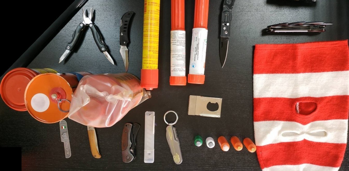 Στην κατοχή του 23χρονου βρέθηκε το αφαιρεθέν σακίδιο πλάτης με τα προσωπικά έγγραφα του παθόντα, στον οποίο αποδόθηκαν. Επιπρόσθετα, στο πλαίσιο των ερευνών στα σπίτια των κατηγορουμένων, βρέθηκαν και κατασχέθηκαν στο σπίτι του 23χρονου: πέντε φωτοβολίδες, τρία καπνογόνα, δύο πυρσοί χειρός, βεγγαλικό χειρός, μεταλλική σιδερογροθιά, τρεις σουγιάδες, πτυσσόμενο μαχαίρι, πολυεργαλείο και κουκούλα τύπου full-face.