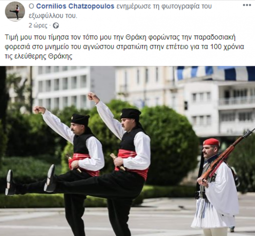 Την επέτειο της συμπλήρωσης 100 χρόνων από την απελευθέρωση της Θράκης και της ενσωμάτωσης στον εθνικό κορμό, δυο άνδρες της Προεδρικής Φρουράς φόρεσαν για πρώτη φορά την Θρακιώτικη ενδυμασία και ο Κορνήλιος Χατζόπουλος που γεννήθηκε το 1999 και από μικρός ήθελε να υπηρετήσει στην Προεδρική Φρουρά ως Εύζωνας, ήταν ένας από αυτούς. Ο ίδιος έγραψε χθες στην προσωπική του σελίδα στο facebook για αυτή την ξεχωριστή στιγμή της ζωής του: