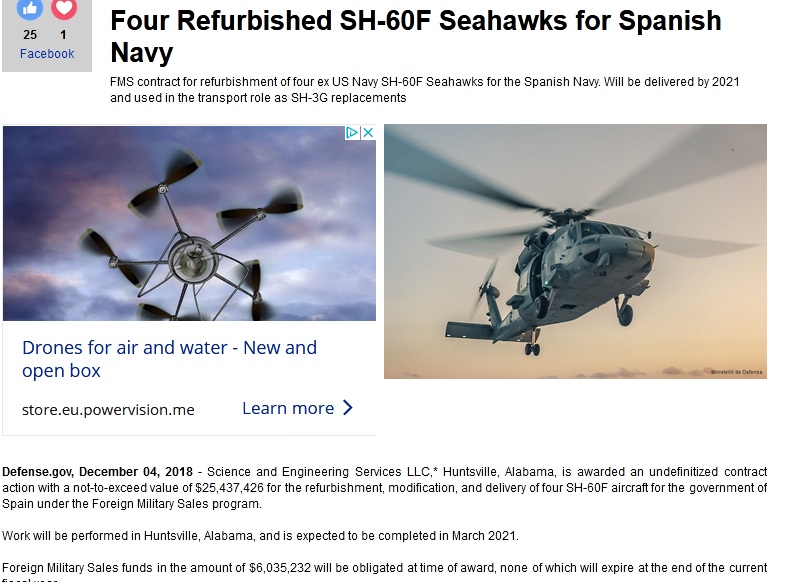 Την ίδια ώρα η Ισπανία παραλαμβάνει 4 ανθυποβρυχιακά ελικόπτερα SH-60F από τα αποθέματα του αμερικανικού Ναυτικού πλήρως αναβαθμισμένα έναντι 25 εκατ. $ και τα οποία πρόκειται να παραδοθούν το 2021!