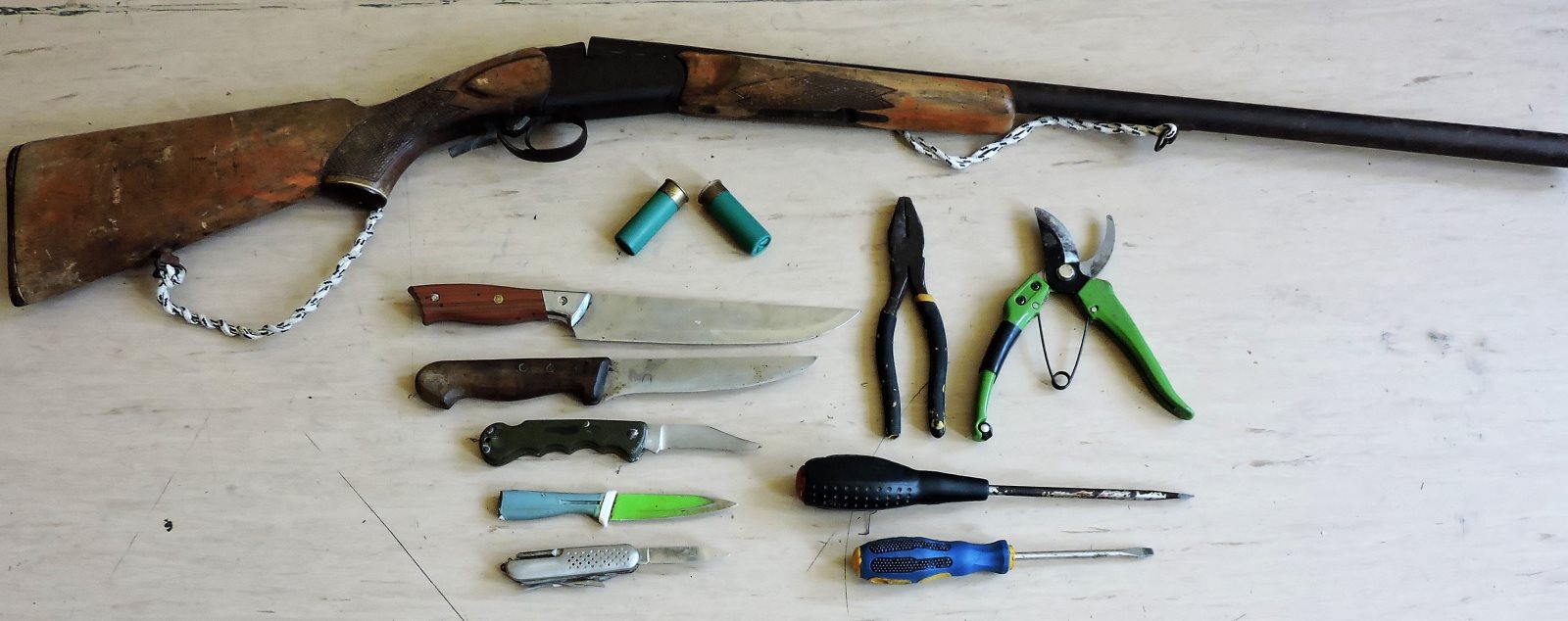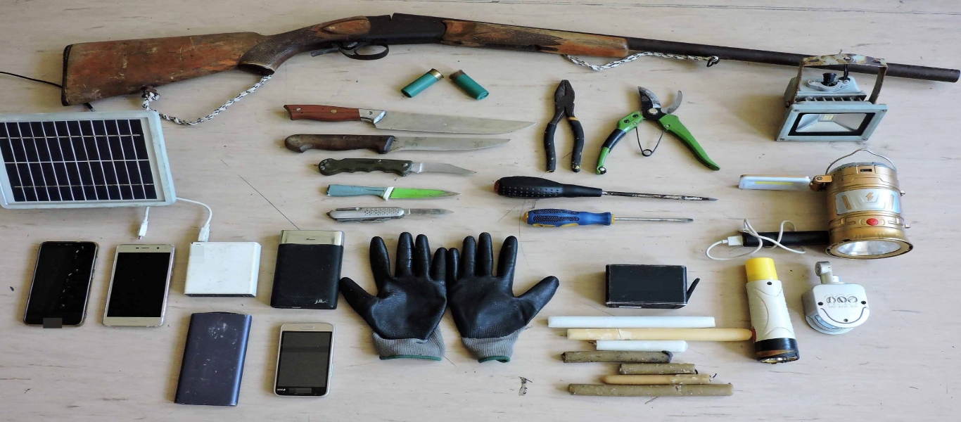 Από τις έρευνες που πραγματοποιήθηκαν στην ευρύτερη περιοχή του εντοπισμού του δράστη καθώς και στην κατοχή του βρέθηκαν από του αστυνομικούς μεταξύ άλλων, οπλισμένο κυνηγητικό μονόκαννο όπλο, δύο φυσίγγια, μαχαίρια, σουγιάδες καθώς και εξοπλισμός διαβίωσης στην ύπαιθρο. Συγκεκριμένα στην κατοχή του βρέθηκε και κατασχέθηκε τσαντάκι μέσης που περιείχε δύο κινητά τηλέφωνα και σε κοντινή απόσταση από το σημείο εντοπισμού του βρέθηκαν και κατασχέθηκαν ακόμη σακίδιο παραλλαγής, ένας υπνόσακος, 4 συσκευές αποθήκευσης ηλεκτρικής ενέργειας και κατσαβίδια.