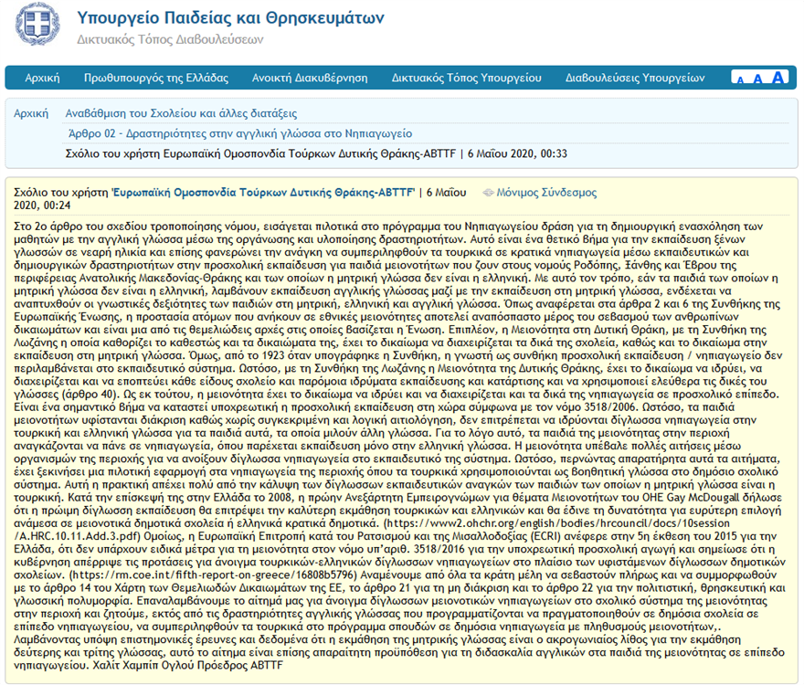 Στο πλαίσιο της διαβούλευσης του σχετικού άρθρου του νομοσχεδίου στην πλατφόρμα της ελληνικής κυβέρνησης, «opengov.gr», 4 μειονοτικοί φορείς έκαναν παρέμβαση απαιτώντας τη διδασκαλία της τουρκικής γλώσσας στα νηπιαγωγεία.