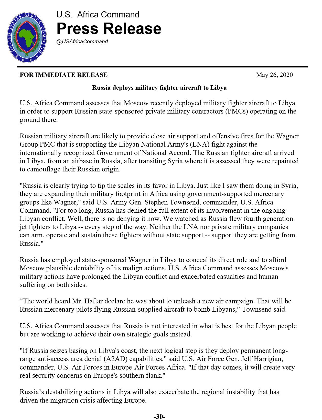 «Η Αφρικανική διοίκηση των Αμερικανικών Ενόπλων Δυνάμεων εκτιμά ότι η Μόσχα ανέπτυξε πρόσφατα στρατιωτικά μαχητικά αεροσκάφη στη Λιβύη προκειμένου να στηρίξει ιδιωτικές στρατιωτικές εταιρίες (PMC) που λειτουργούν εκεί.