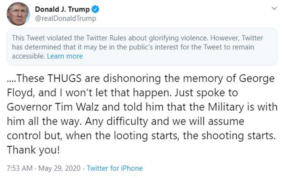 «Αυτοί οι αλήτες αμαυρώνουν την μνήμη του Τζορτζ Φλόιντ και αυτό δεν θα το αφήσω να συμβεί. Μόλις μίλησα με τον κυβερνήτη Τιμ Βαλζ και του είπα πως ο στρατός είναι μαζί του μέχρι το τέλος. Θα αναλάβουμε τον έλεγχο παρά τις δυσκολίες. Όταν ξεκινάει η λεηλασία, τότε αρχίζουν και τα πυρά». αναφέρει το tweet του Αμερικανού προέδρου, αναφερόμενο στις ταραχές που μαίνονται στην αμερικάνικη πόλη, μετά τη δολοφονία του 46χρονου Αφροαμερικανού Τζορτζ Φλόιντ από την αστυνομία.
