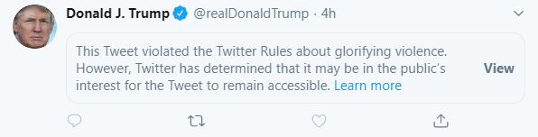 Το σχόλιο δεν σβήστηκε από τον λογαριασμό του Αμερικανού προέδρου, αλλά «καλύφθηκε» με μία προειδοποίηση που τονίζει ότι «αυτό το tweet παραβιάζει τους κανόνες του Twitter σχετικά με την εκθείαση της βίας», δίνοντας τη δυνατότητα ανάγνωσης του μόνο μετά από κλικάρισμα πάνω στο προειδοποιητικό μήνυμα.