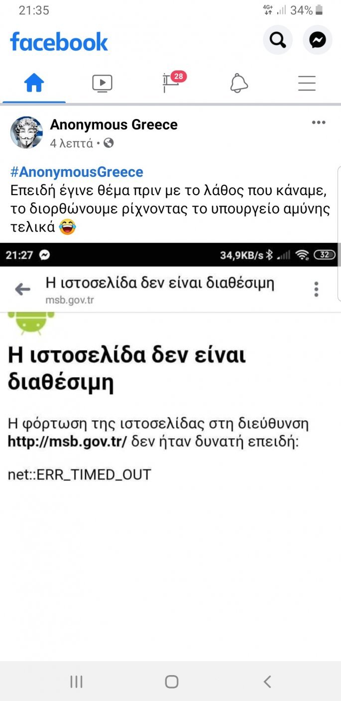 Οι Ελληνες χάκερ, με ανάρτησή τους στο Twitter αναφέρουν ότι «έριξαν» τη σελίδα του τουρκικού υπουργείου Εθνικής Άμυνας, εξηγώντας, μεταξύ άλλων, τα εξής: «Μετά από επίθεση που δέχθηκε η Ελλάδα και συγκεκριμένα ένας δήμος της Ελλάδας (κάτι ασήμαντο για εμάς) από την Τουρκία, προχωρήσαμε και εμείς σε επίθεση. Το τουρκικό υπουργείο Εθνικής Αμύνης είναι εκτός». Τελικά, όπως αποδείχθηκε, είχαν επιτεθεί στη σελίδα του τουρκικού υπουργείου Εξωτερικών.