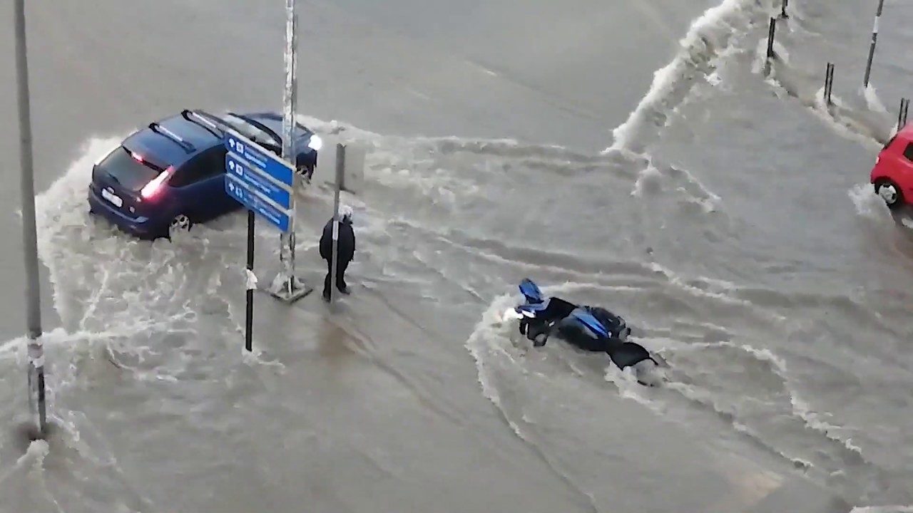 Δύσκολες στιγμές έζησε ένας οδηγός μηχανής στη Θεσσαλονίκη το Σάββατο, καθώς τα ορμητικά νερά τον παρέσυραν την ώρα που έστριβε.