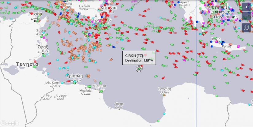 Το τουρκικό πλοίο CIRKIN όπως φαίνεται και στον χάρτη έμφορτο με όπλα συνεχίζει απτόητο την πορεία του για την Τρίπολη συνοδευόμενο από τρεις τουρκικές φρεγάτες.