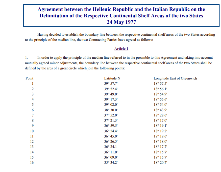 «Η οριοθέτηση προς το παρόν δεν σκοπείται να επεκταθεί πέρα του σημείου 1 προς τον Βοράν και του σημείου 2 προς τον Νότο. Η παρούσα οριοθέτηση θα επεκταθεί προς οιαδήποτε κατεύθυνση μέχρι τα σημεία συνάντησης των θαλασσίων ζωνών των αντίστοιχων γειτονικών Κρατών, όταν θα έχουν συναφθεί οι σχετικές συμφωνίες», αναφέρει η παράγραφος 3 του άρθρου 1 της συμφωνίας