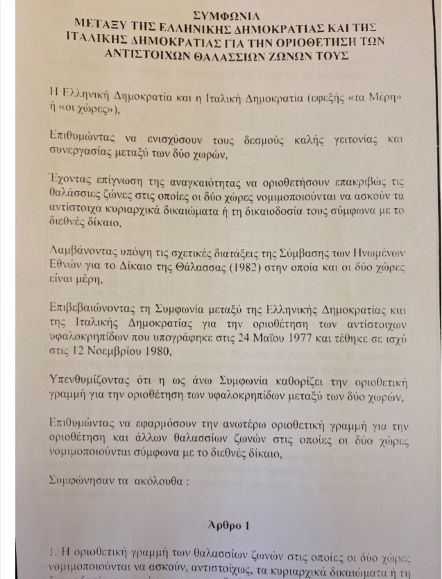 Στη δημοσιότητα δόθηκε η συμφωνία Ελλάδας-Ιταλίας για τις θαλάσσιες ζώνες και υπήρξε πλήρης επιβεβαίωση του pronews.gr, το οποίο έγγραφε από την πρώτη στιγμή πως πρόκειται για «ξεπατίκωμα» της συμφωνίας για τις υφαλοκρηπίδες του 1997, που δεν επηρεάζει ούτε τη λιβυκή ΑΟΖ αλλά επιπλέον δίνει μειωμένη επήρεια στα ελληνικά νησιά.