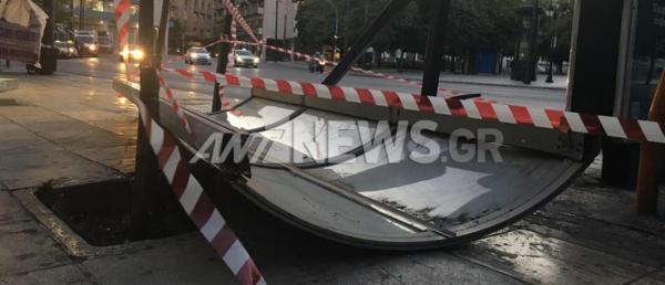 Η στάση καταστράφηκε, με το στέγαστρο να πέφτει και τις λαμαρίνες να έχουν «λυγίσει».