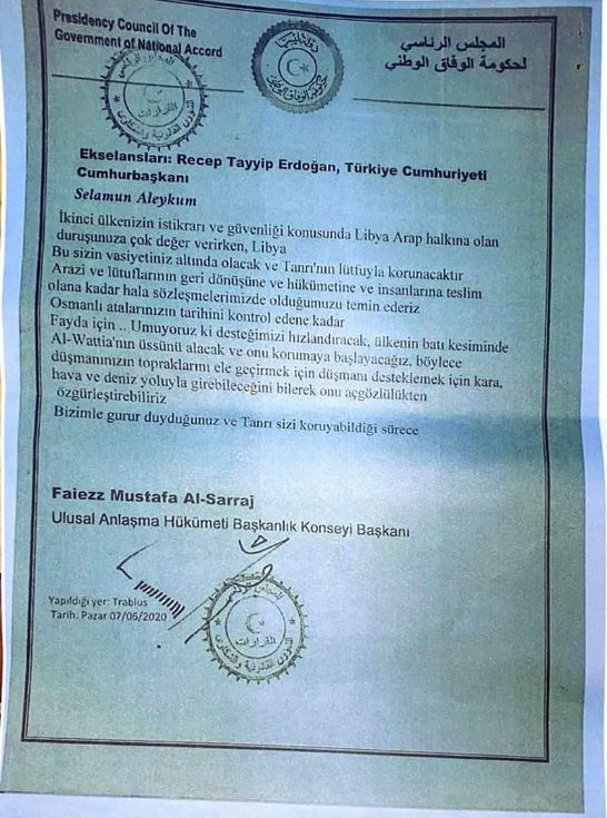 Η επιστολή της 7ης Ιουνίου 2020 που υπογράφεται από τον Φαγιέζ Σάρατζ (Faiezz Mustafa Al-Sarraj) είναι γραμμένη στα τουρκικά και διέρρευσε σήμερα από την λιβυκή Εθνική Στρατιωτική Υπηρεσία ως «μυστική επιστολή της 7ης Ιουνίου 2020».