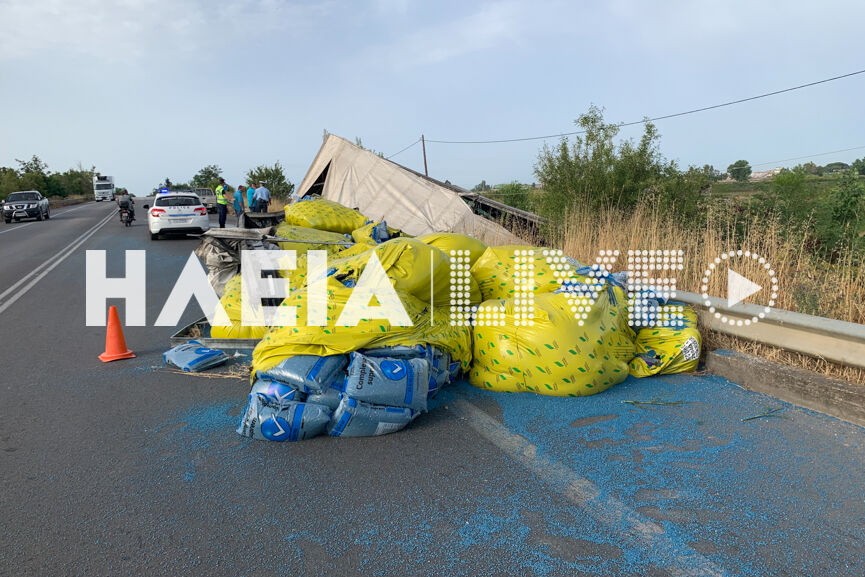 Η νταλίκα ήταν φορτωμένη με συσκευασμένο λίπασμα σε σακιά, τα οποία σκόρπισαν στην Πατρών -Πύργου δίπλα στο βαρύ όχημα.