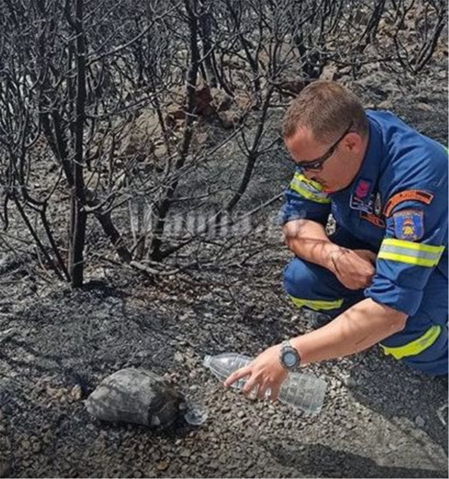 Μετά την μεγάλη πυρκαγιά στο Μαρτίνο Φθιώτιδας, εμφανίστηκε μέσα από τα αποκαΐδια, μια αρκετά ταλαιπωρημένη και διψασμένη χελώνα.