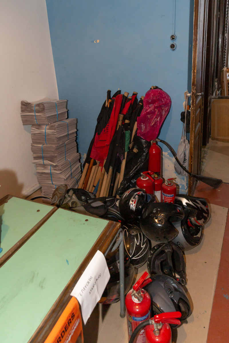 Συγκεκριμένα, οι αστυνομικές αρχές βρήκαν κοντάρια, κράνη κι άλλα αντικείμενα που θα μεταφερθούν στα εργαστήρια της ΕΛ.ΑΣ. για αν εξεταστούν για DNA και αποτυπώματα.
