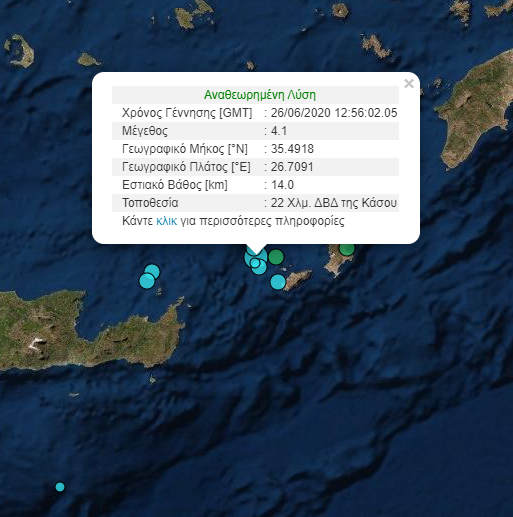 Σεισμός 4,1 ρίχτερ πραγματοποιήθηκε πριν από λίγη ώρα ανοιχτά της Κάσου και πιο συγκεκριμένα σε θαλάσσιο χώρο 25 χιλιόμετρα βορειοδυτικά του νησιού