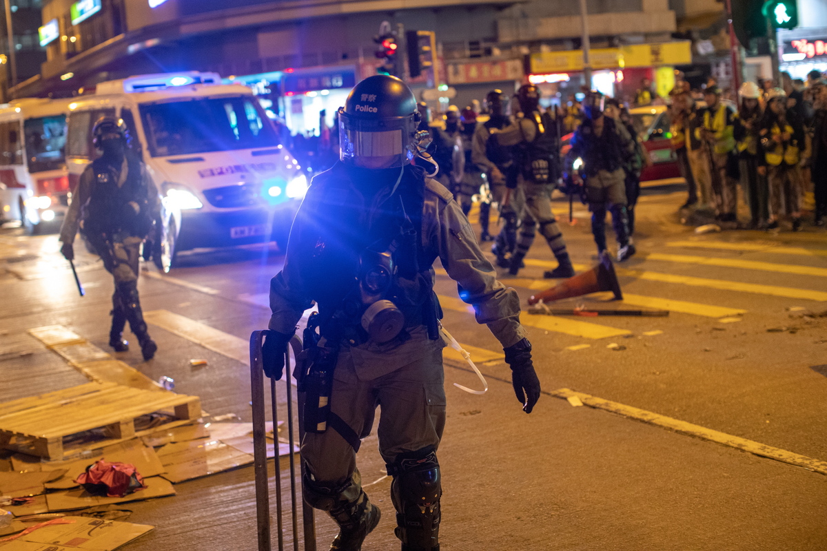 Ωστόσο, οι διαδηλωτές φώναζαν συνθήματα κατά των αστυνομικών δυνάμεων, ενώ αργότερα ξέσπασαν συμπλοκές στην περιοχή Μονγκ Κοκ, προκαλώντας την αστυνομία να κάνει χρήση σπρέι πιπεριού, ώστε να διαλύσει ομάδες των συγκεντρωμένων.