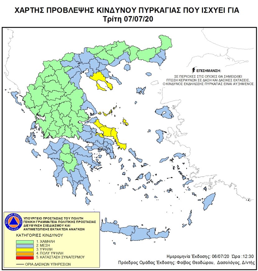 Συγκεκριμένα, σύμφωνα με τον Χάρτη Πρόβλεψης Κινδύνου Πυρκαγιάς που εκδίδει η Γενική Γραμματεία Πολιτικής Προστασίας, για σήμερα Τρίτη 7 Ιουλίου 2020, προβλέπεται υψηλός κίνδυνος πυρκαγιάς (κατηγορία κινδύνου 3) σε Εύβοια, Σποράδες και Χαλκιδική.