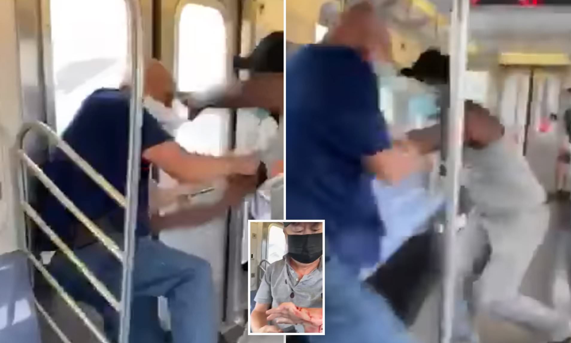 Όπως φαίνεται στο βίντεο που ανέβηκε στο Facebook και γρήγορα έγινε viral, ο 46χρονος κλωτσάει τους ηλικιωμένους άντρες που βρίσκονται στο πάτωμα του συρμού.
