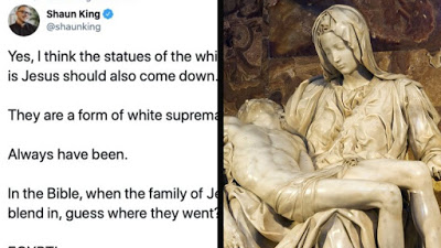 Τα ιερά θρησκευτικά αγάλματα που απεικονίζουν τον Χριστό με ανοιχτόχρωμο δέρμα «είναι μια μορφή λευκής υπεροχής… Ρίξτε τα», έγραψε ο «ακτιβιστής» Shaun King το απόγευμα της Δευτέρας. «Όλες οι τοιχογραφίες και τα βιτρό με τον λευκό Ιησού, και την Ευρωπαία μητέρα του, και τους λευκούς τους φίλους πρέπει και αυτά να πέσουν κάτω».