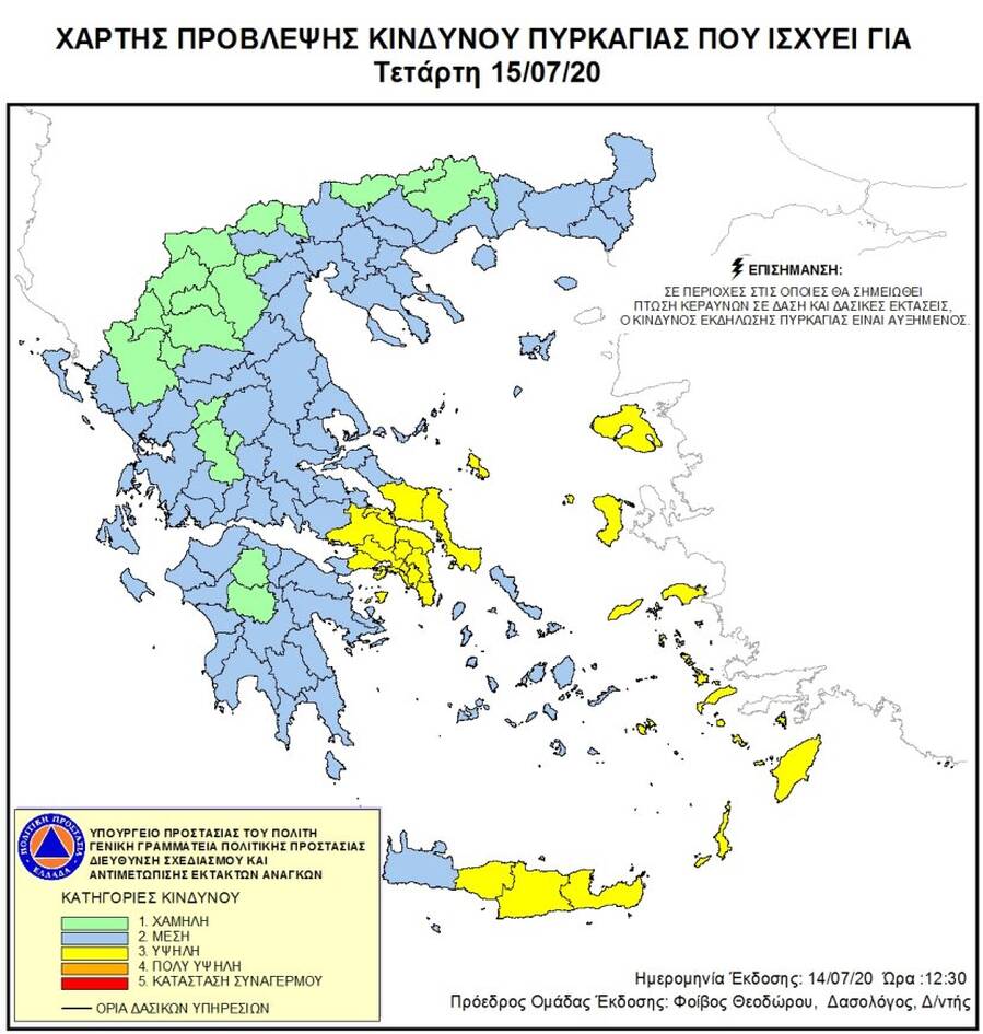 Για σήμερα Τετάρτη 15 Ιουλίου, σύμφωνα με το Χάρτη Πρόβλεψης Κινδύνου Πυρκαγιάς που εκδίδει η Γενική Γραμματεία Πολιτικής Προστασίας του Υπουργείου Εσωτερικών και Διοικητικής Ανασυγκρότησης, προβλέπεται υψηλός κίνδυνος πυρκαγιάς (κατηγορία κινδύνου 3), σε ορισμένες περιοχές της Ελλάδας.