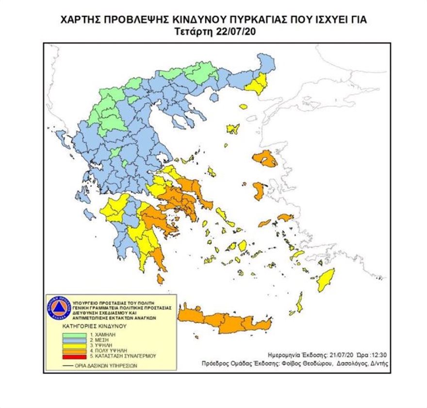 Ειδικότερα, σύμφωνα με τον Χάρτη Πρόβλεψης Κινδύνου Πυρκαγιάς, που εκδίδει η Γενική Γραμματεία Πολιτικής Προστασίας, σε κατηγορία κινδύνου 4 είναι οι εξής πέντε περιφέρειες: