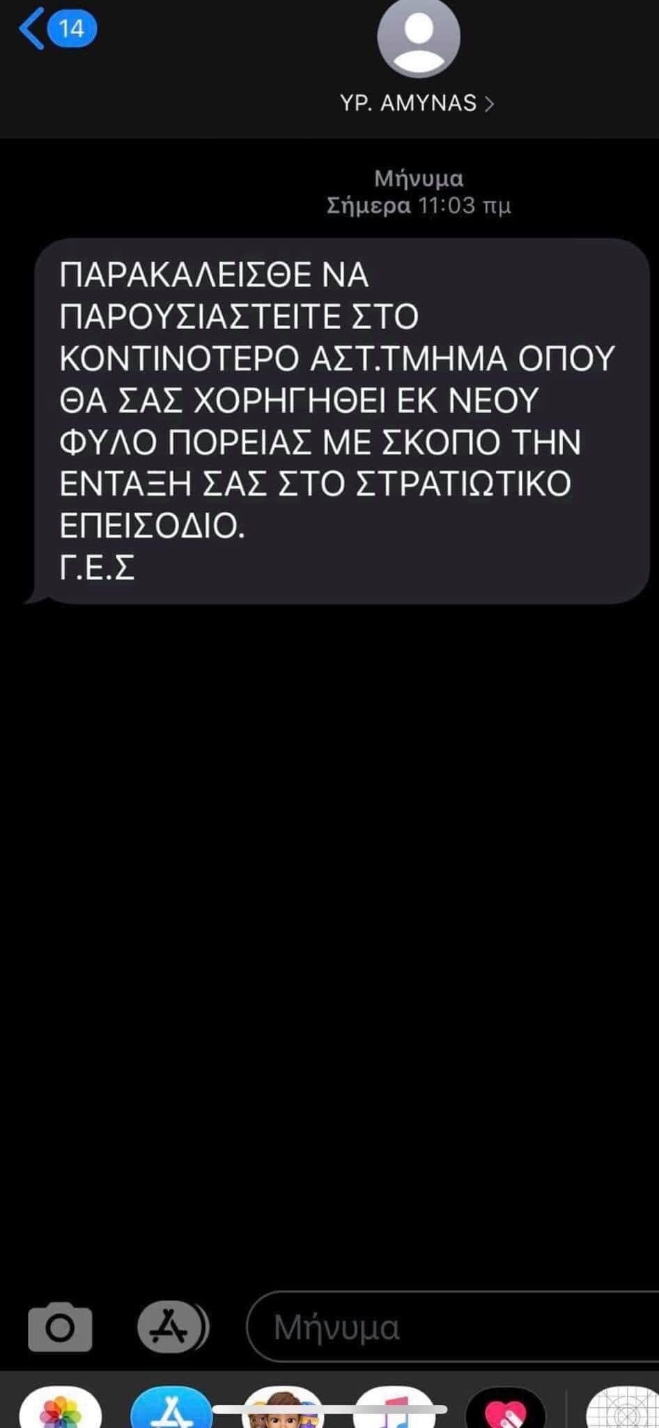 Στο μήνυμα αναγράφονταν πως το ΥΠΕΘΑ ξεκινάει διαδικασία επιστράτευσης και καλούσε τους πολίτες να παρουσιαστούν στα… αστυνομικά τμήματα της περιοχής τους για να λάβουν φύλλα πορείας.