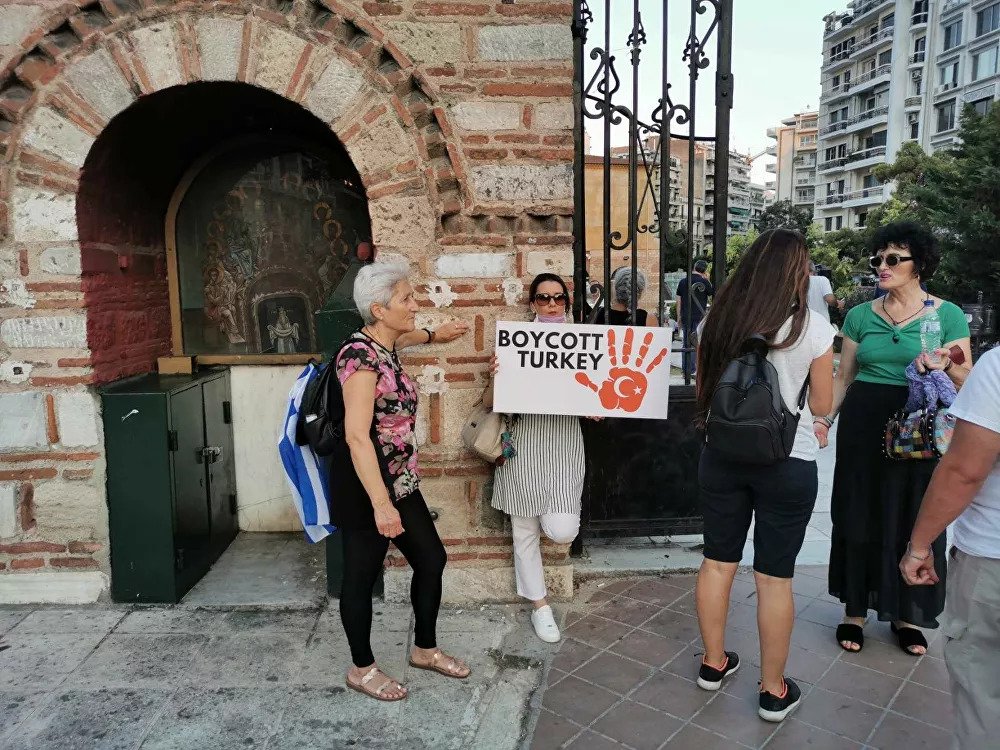Μία από τους διαδηλωτές, παράλληλα, κρατούσε πλακάτ, το οποίο καλούσε τους Έλληνες να «μποϊκοτάρουν» την Τουρκία.