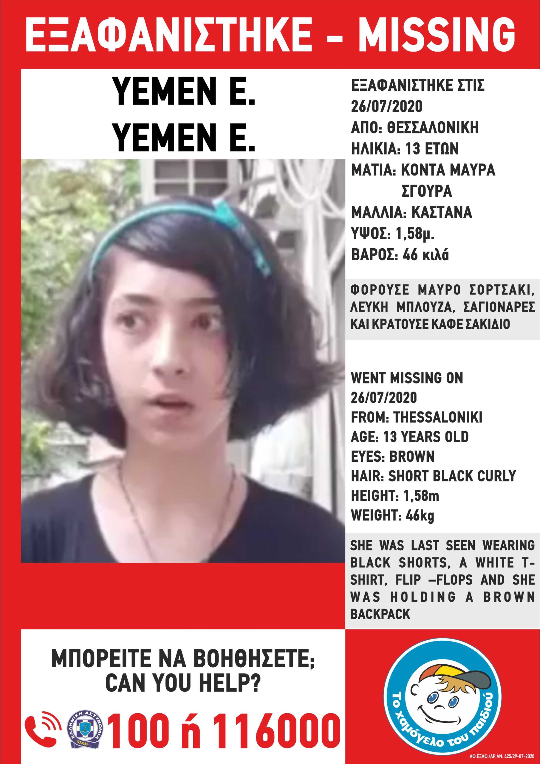 Όπως αναφέρεται, στη σχετική ανακοίνωση: «Στις 26/07/2020, στις 14:00, εξαφανίστηκε από το σπίτι της στην περιοχή της Θεσσαλονίκης, η Υεμέν Ε., 13 ετών. Το “Χαμόγελο του Παιδιού” ενημερώθηκε για την εξαφάνιση της Υεμέν Ε. σήμερα, 29/07/2020, και προχώρησε άμεσα στη δημοσιοποίηση των στοιχείων της.