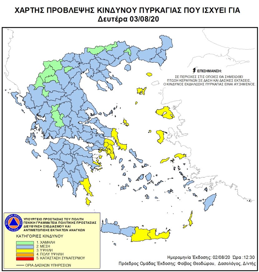 Συγκεκριμένα, σύμφωνα με το Χάρτη Πρόβλεψης Κινδύνου της Γενικής Γραμματείας Πολιτικής Προστασίας, για τις 3 Αυγούστου προβλέπεται υψηλός (κατηγορία 3) κίνδυνος φωτιάς στις εξής περιοχές: