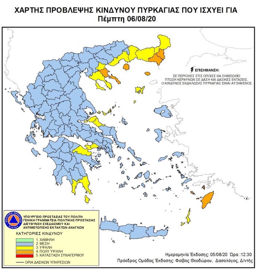 Αρκετά υψηλός είναι και για σήμερα 6 Αυγούστου, ο κίνδυνος εκδήλωσης πυρκαγιάς (κατηγορία 4), σε ορισμένες περιοχές της Ελλάδας, σύμφωνα με το Χάρτη Πρόβλεψης Κινδύνου Πυρκαγιάς που εκδίδει η Γενική Γραμματεία Πολιτικής Προστασίας του Υπουργείου Εσωτερικών και Διοικητικής Ανασυγκρότησης.