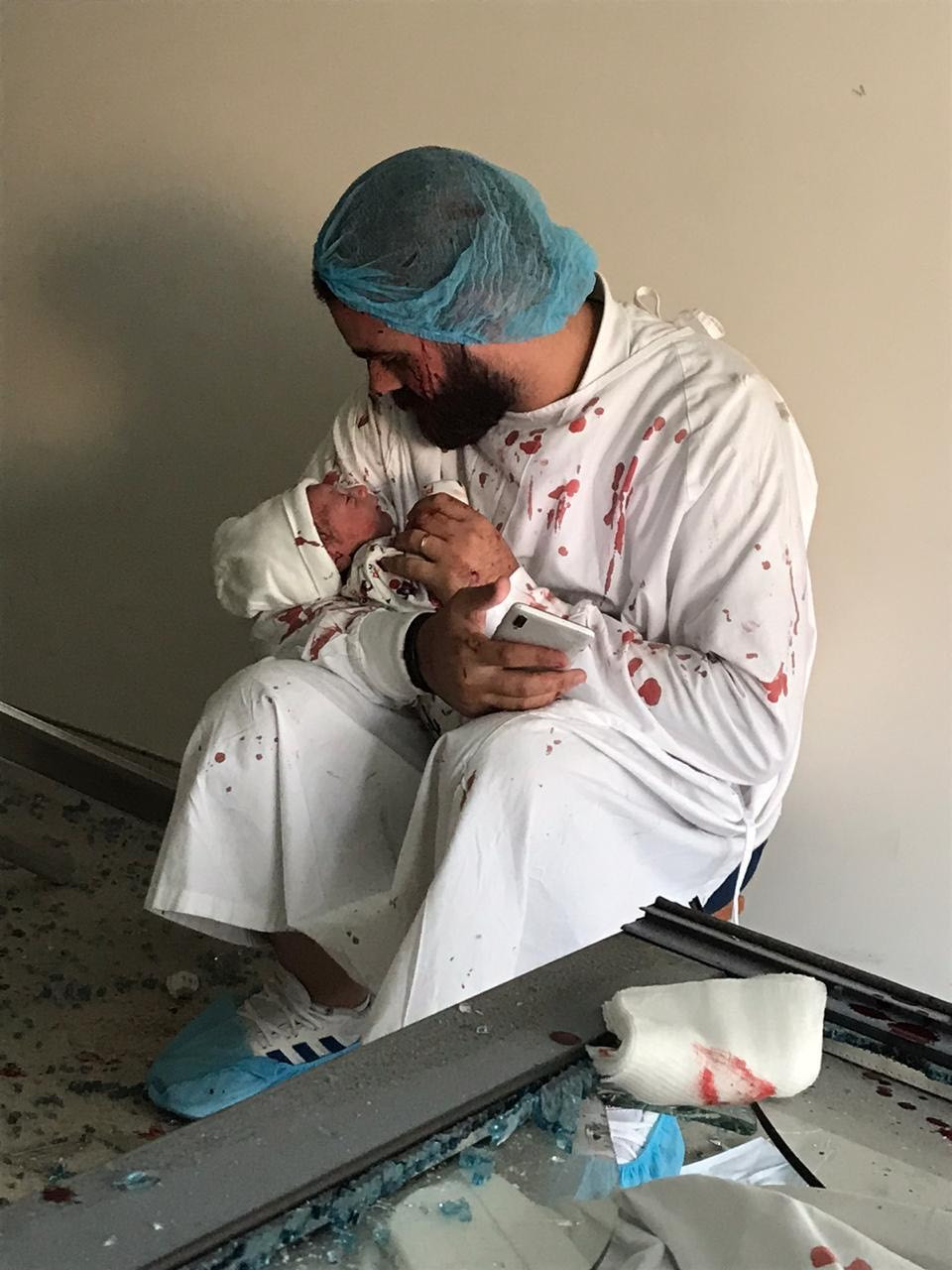 «Δεν ξέραμε τι πραγματικά συνέβη. Όλα γύρω μας ήταν κατεστραμμένα, αίμα και τραυματίες παντού», λέει ο νεαρός πατέρας, ο οποίος το μόνο που σκεφτόταν εκείνη τη στιγμή ήταν να μεταφέρει τη σύζυγο και τον γιο του σε άλλο νοσοκομείο που δεν είχε πληγεί από την έκρηξη.
